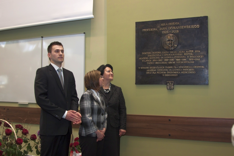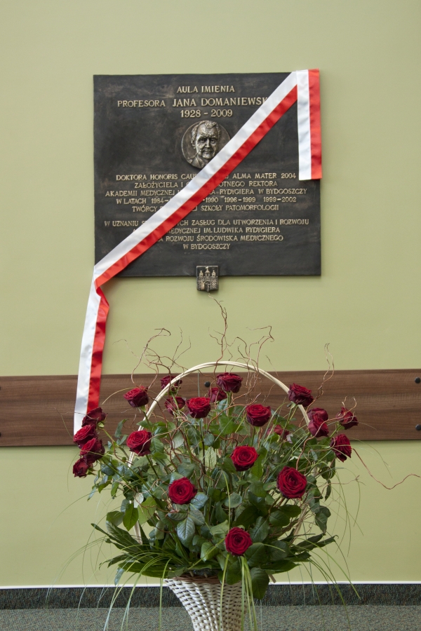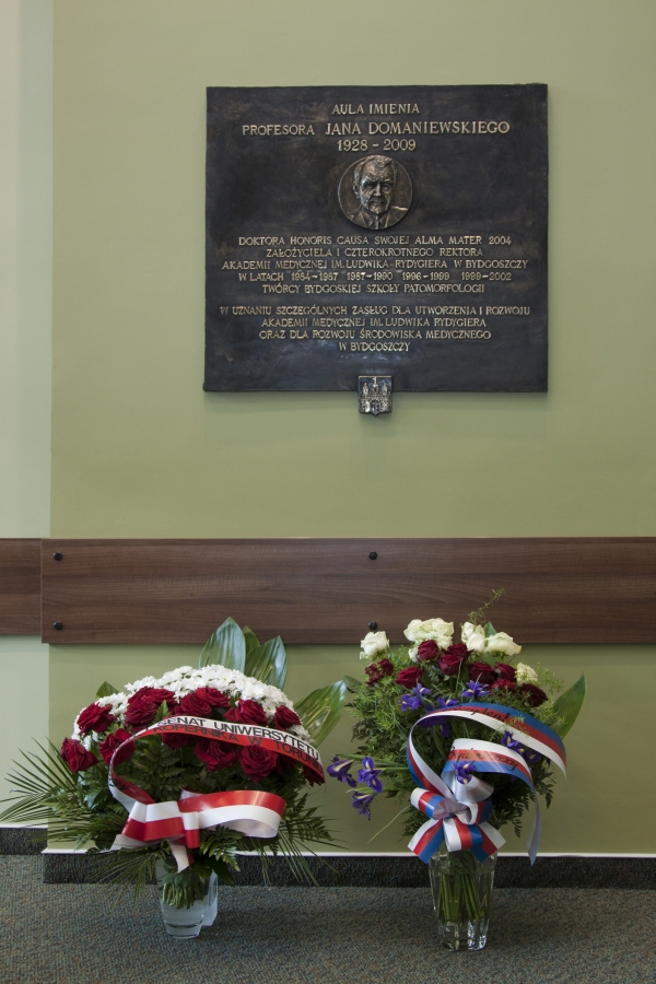 11 marca 2011 r. nastąpiło odsłonięcie tablicy poświęconej pamięci Profesora zw. dr. hab. med. Jana Domaniewskiego, założyciela i czterokrotnego Rektora Akademii Medycznej im. L. Rydygiera w Bydgoszczy, doktora honoris causa swojej Alma Mater. Uroczystość odbyła się w auli im. prof. Jana Domaniewskiego w budynku audytoryjnym przy ul. M. Curie Skłodowskiej 9 w Bydgoszczy.