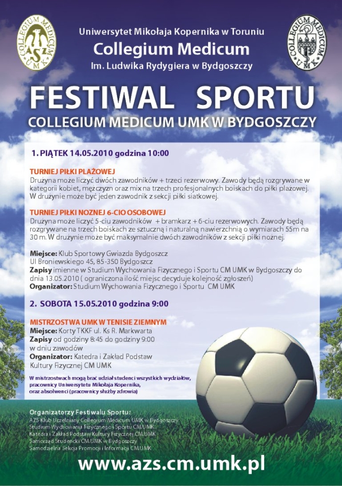 14 maja 2010 r. odbył się drugi Festiwal Sportu Collegium Medicum w Bydgoszczy. Mimo fatalnej pogody w zawodach wzięło udział ponad 200 studentów ze wszystkich wydziałów Collegium Medicum.